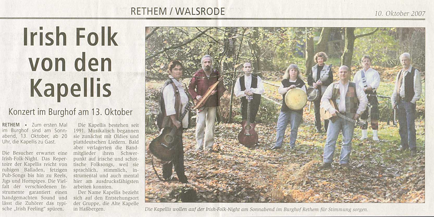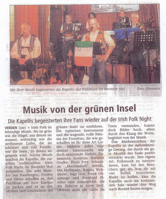 Bericht über 4. Irish Folk Night in Verden (Verdener Aller Zeitung vom 24.04.2007)