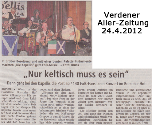 Bericht über die 9. Irish Folk Night in Verden 2012 (Verdener Aller-Zeitung 24.4.2012)